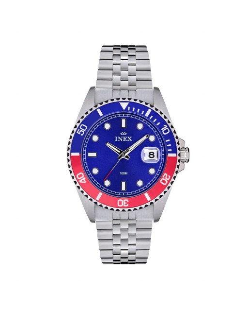 Klassisk herreklokke fra Inex med solid stållenke. Klokkens blå skive og rød & blå bezel skaper en kontrast til den blanke stållenken og gir den et moderne og elegant utseende.