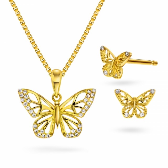 Sett i forgylt sølv, sommerfugl med zirkonia Bredde anheng: 17 mm. Bredde ørepynt: 8 mm NOK799,00 inkl. mva. På lager Kjøp Del dette