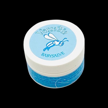 Babysalve frå Vossabia er ein 100% naturleg og pleiande salve for den sarte babystumpen. Smør på rein hud etter kvart bleieskift for å beskytte og mjuke opp huden. Med bivoks, øko. tistel- og jojobaolje som gir god pleie til huden.