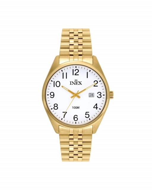 Herreklokke fra Inex med gullfarget stålkasse og hvit skive. Skiven har sorte arabertall, gullfargede visere og datovisning klokken 3. Skiven beskyttes av et mineralglass, og klokken har en vanntetthet på 100 meter. Den solide lenken er laget av gullfarget rustfritt stål og ligger behagelig rundt håndleddet.